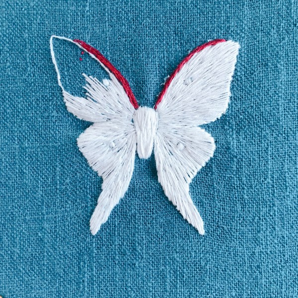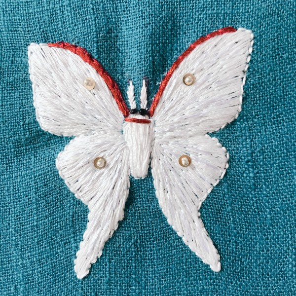 ロングアンドショートステッチで、オオミズアオを刺繍しました。