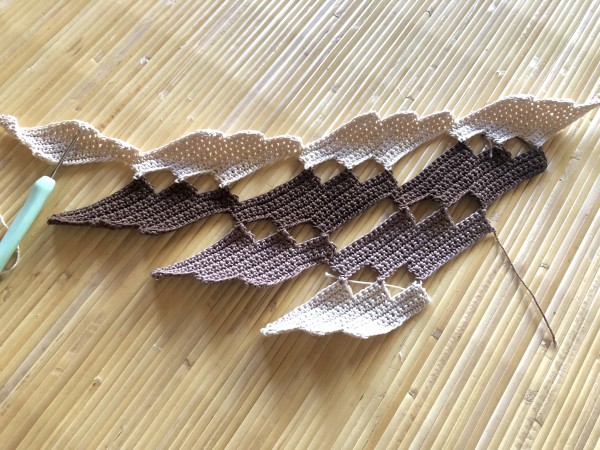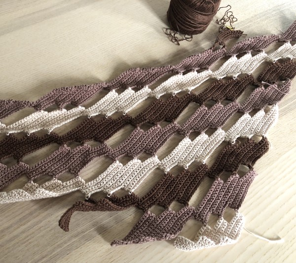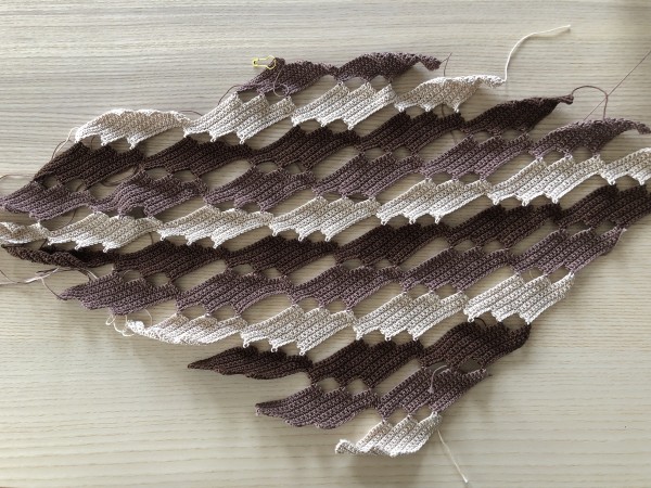 ひし形を繰り返しながら成長させていってます。巻いたらどんな雰囲気になるのかとても楽しみなのだけど、なかなか成長させられず焦る。でも、同じ編み方の繰り返しなので、テレビ見ながらでも大丈夫です(^^)