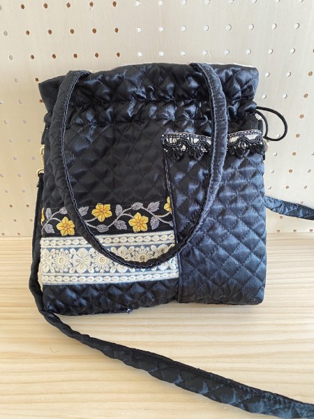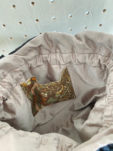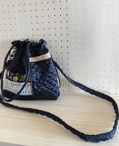 | 母の誕生日にあげるため作りました。大人っぽいけど可愛らしさも出るように意識して素材を選びました。ベースはサテンのキルティングで少し艶っぽくし、刺繍のブレードを計4種類使って可愛らしさと個性を出しています。 巾着型できゅっと絞れるけどスマホなどはすぐに取り出せるように外側に二つ大きなポケットをつけています。 中にはウィリアムモリスの布で作ったポケットをつけています。 色んな持ち方が出来るようにしたかったので、取り外しが出来るショルダー紐もつけました。肩にかけた時の負担が少なくなるように同じキルティング素材を使っています。 工程が多く大変でしたが、概ね想像通りの出来になり満足しています。 |