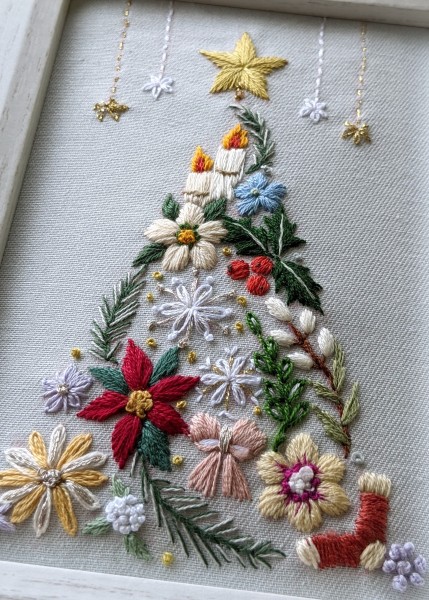 まいたけ 2年 ありがとうございます( ´◡‿ゝ◡`) クリスマスツリーといえば、近年はオシャレで洗練されたものが主流ですが、私はやはり昭和のカラフルな豆電球的な電飾のツリーの雰囲気がノスタルジックで好きです。 刺繍だとツリーも思うままデザインできます(^^)