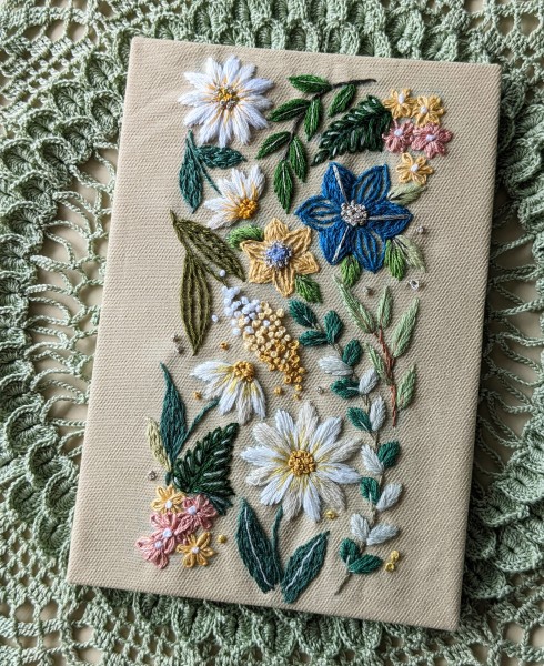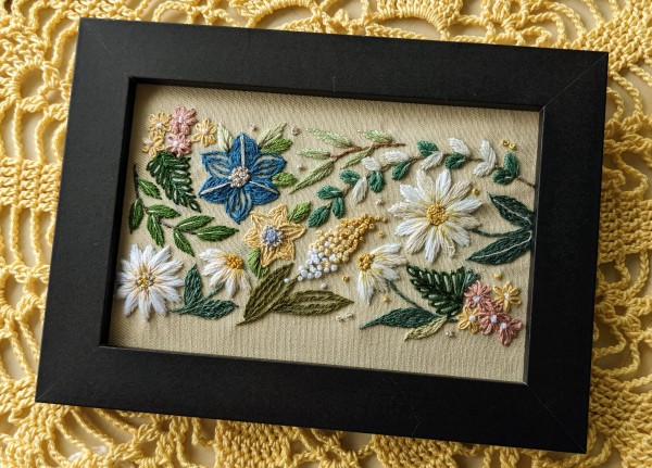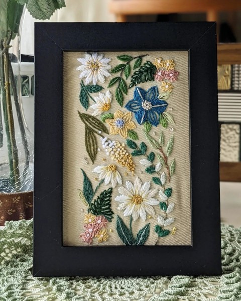 秋の花を少し意識した花で、なんとなく秋らしい雰囲気の刺繍フレームになりました。