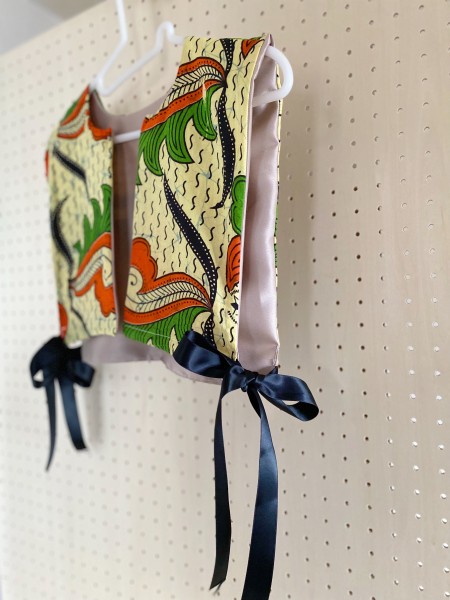 | ヴィンテージのファブリックで作った付け襟です。 アフリカンバティックのワンピースを丈上げした際に切った部分を再利用しました。 一枚だとペラペラしてしまうので裏地をつけました。 サイドはリボンで結べるようにしています。 無地のシャツやロンTなどシンプルな服に合わせるだけでいつもとは違った雰囲気になります。 |