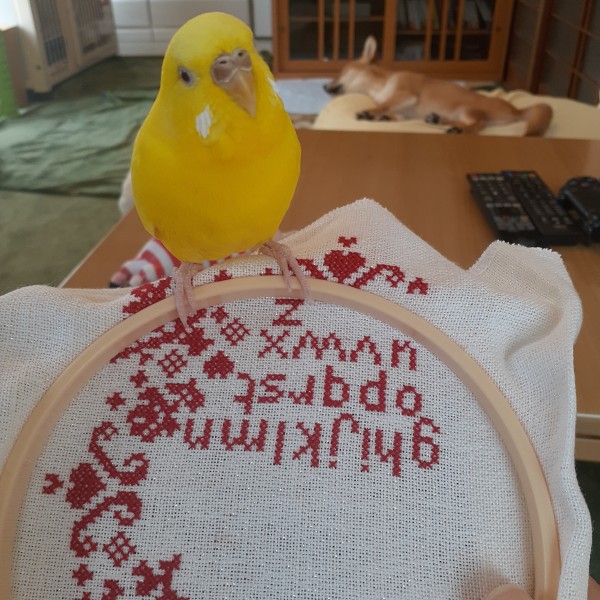 昼間は犬のももちゃんは寝てるんですが、ききちゃんに邪魔されながらステッチしています(^o^)