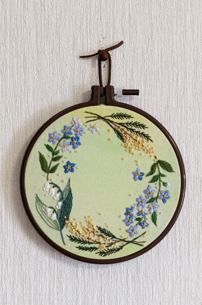 ミモザと勿忘草とすずらんを自分好みの図案で作りました。
