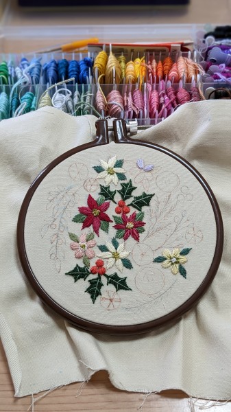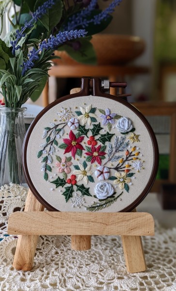 クリスマスの花々や雪の結晶などを盛りだくさんに刺繍しました。銀のラメ糸が薔薇の花と結晶を上品に輝かせています。