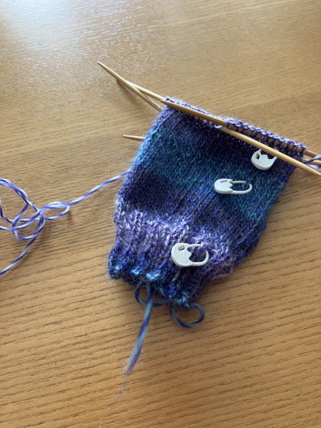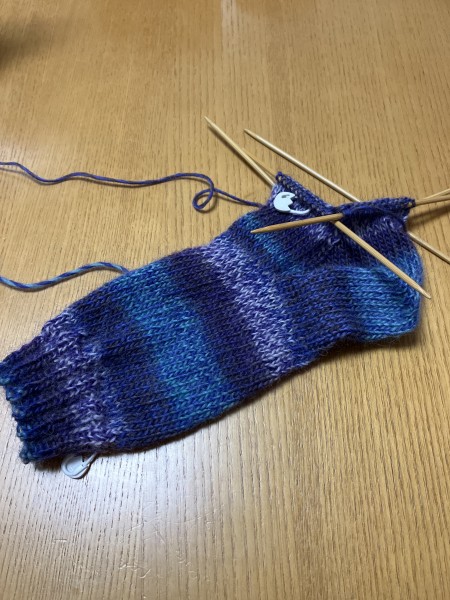 ぴったりサイズで編んでいたのですが、ソックヤーンじゃないから洗うと縮むことに気付き、目数を増やして(48目→56目)編み直すことにしました。