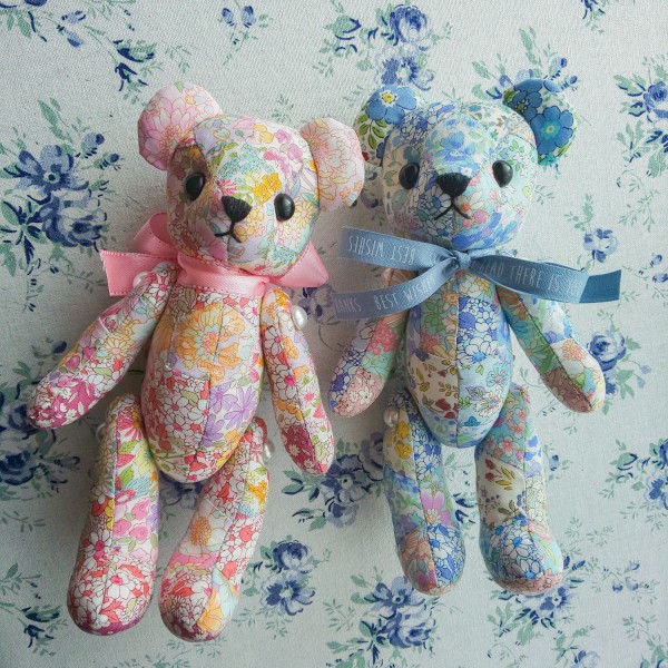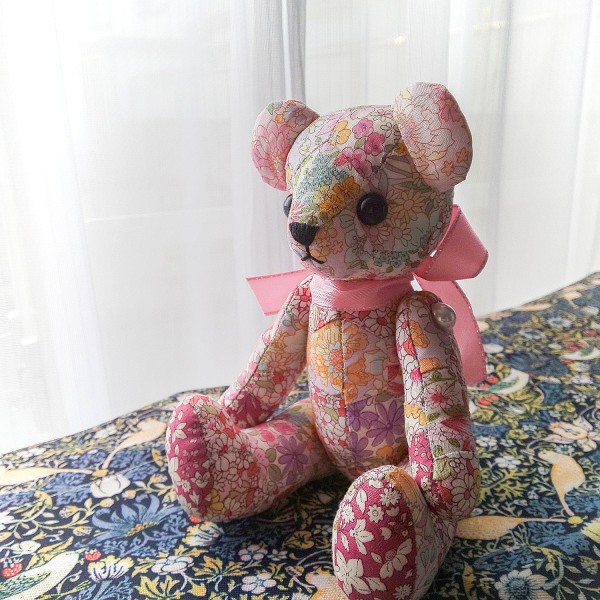 花柄のヘキサゴンピースを、それぞれ93ピースつなぎ合わせてテディベアを作りました。