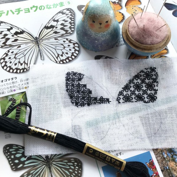 | タテハチョウの仲間、オオゴマダラをブラックワークで刺繍することにしました。 モチーフを組み合わせながら、制作中です。 いつも一気に仕上げてしまう、ちいさな刺繍ですが、ブラックワークは手がかかるので珍しく途中経過もレポートさせていただくことができました。 |