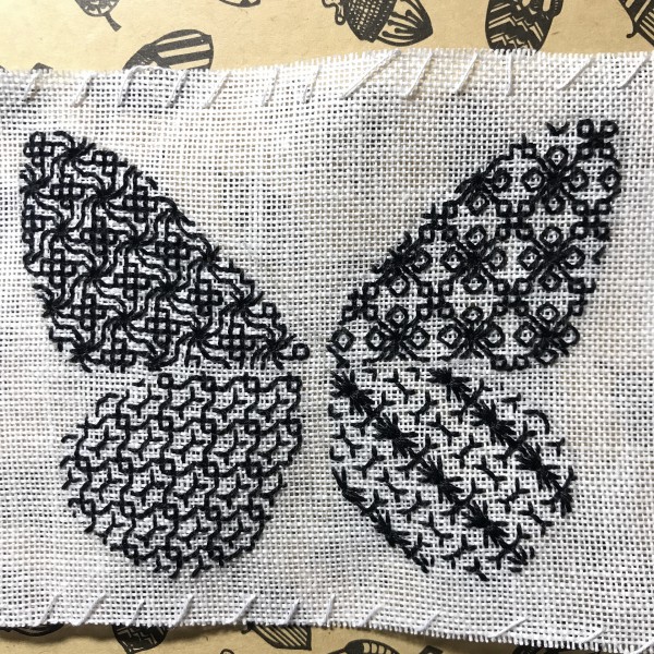 まずは、右上羽に好きなモチーフを選んで刺繍し、左上羽はそれに合わせて別のモチーフを選びました。