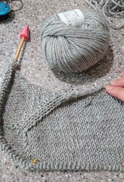 肩とVネックの下部分まで進みました。毛糸3玉目(30g)の終わりかけです。