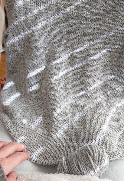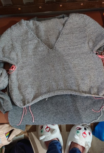 袖、前身頃も編み上がり、残るは後ろ身頃のみです。参考編み図(『Top-Down Sweaters セットインスリーブみたいなトップダウンのセーター』日本ヴォーグ社)のインストラクションも袖丈と身頃は、好みでとの記載、自由に編んでみました。