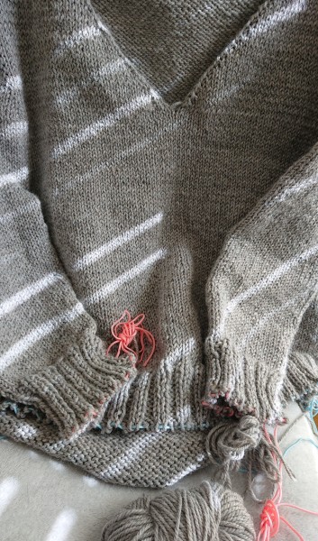 編んでみたら糸の太さがやや不均一で、思ったよりざっくりとした風合いになり、ストライプはちょっとしっくりしないので残念ながらやめる事に。今のところ、袖と裾にゆったりとした長めのゴム編み、裾にはスリットを入れる予定です。袖も身頃も短めにして、シャツが見えるような、重ね着セーターを想定しています。