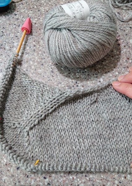 年末忙しくしており進んでいませんでした!現在はこのような状態。腋下は別糸の作り目で裏目を捨い、身頃をつなげて輪に編んでいます。ゆるやかなAラインにするため10目ごとに左右に2目づつ増やし目をする事に。ここから先は袖と身頃をひたすら長くするだけですが、丈や袖の長さなどデザインの方向性を決めないといけません..。