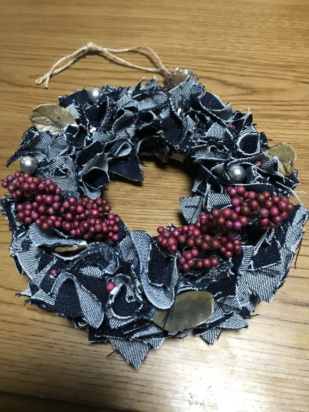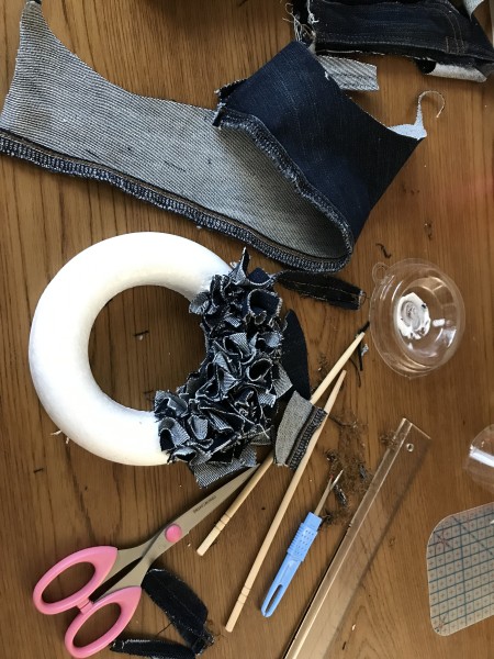 デニムのハギレを発泡スチロールのリース土台に刺して製作。