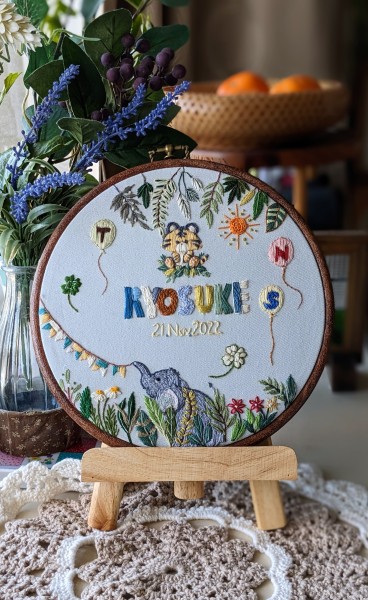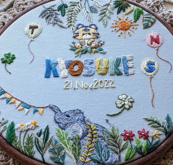 両親と兄弟のイニシャルや、干支の虎に囲まれ、男の子らしい可愛い図案です。