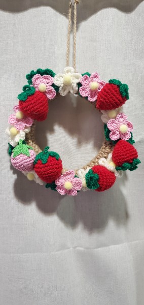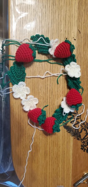 土台は麻ひも、いちご・葉っぱ・花はアクリル毛糸です。