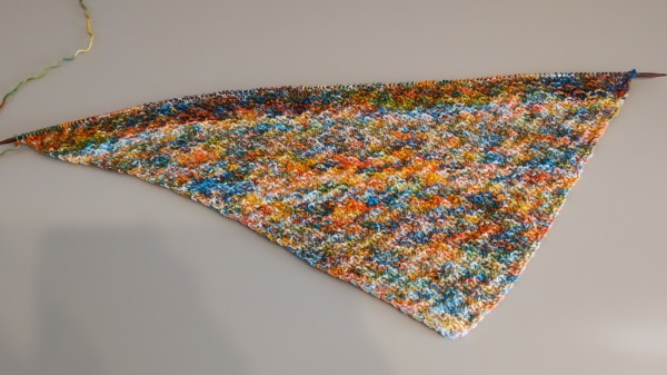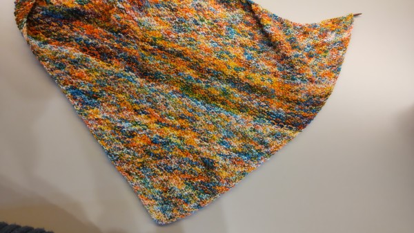 | 毛糸だま2022年冬号の35pのBを参考にした三角のショールです。 左右が対象でない変わった感じに出来上がりました。 |