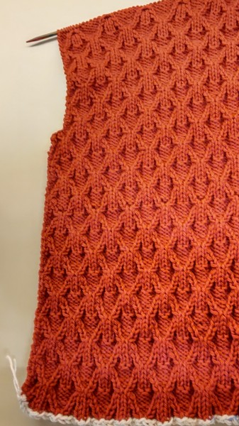 この模様は交差が多くて、記号だけ見たら普段ならスルーしている所なのですが、試しに編んでみたら陰影がいい感じに出ているような気がして選びました。