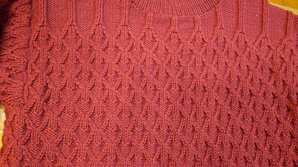 | 赤いセーターが欲しくなって、編みました。「自分サイズのセーターを編む」の表紙の白いセーターを参考にしています。 衿のゴム編みは長くして二重にしました。 |