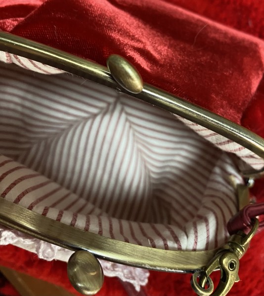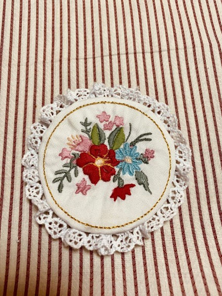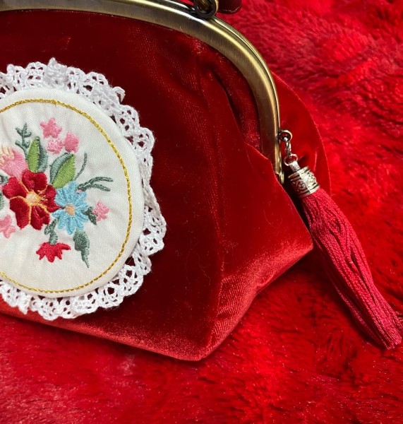 赤いベルベットの生地に、刺繍したお花にフリルをつけて可愛くしてみました。