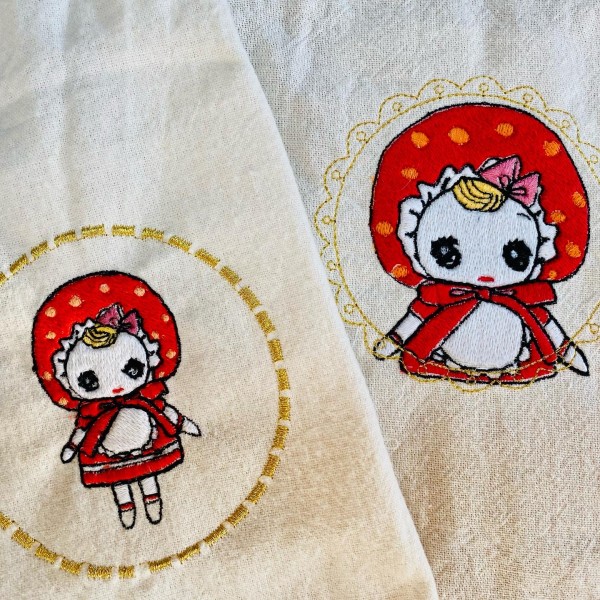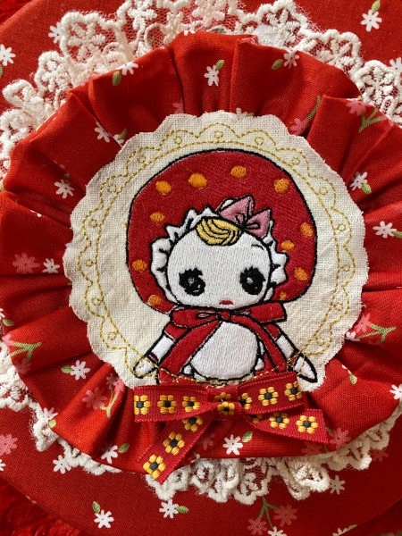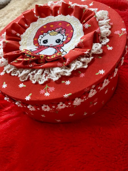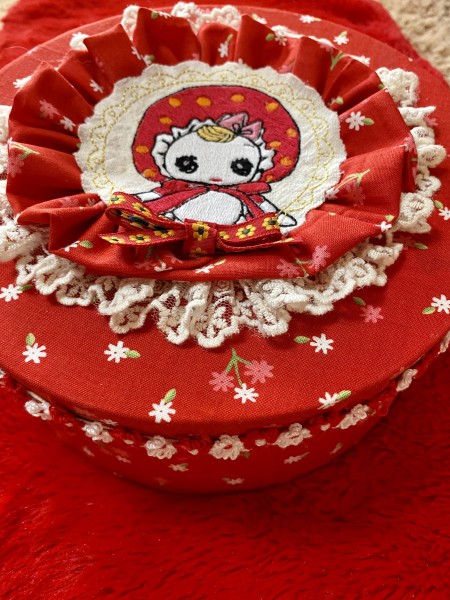 文化人形を刺繍して丸い箱にカルトナージュしました。