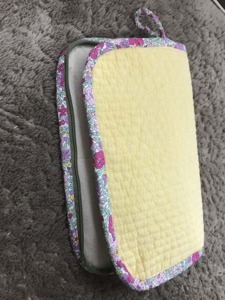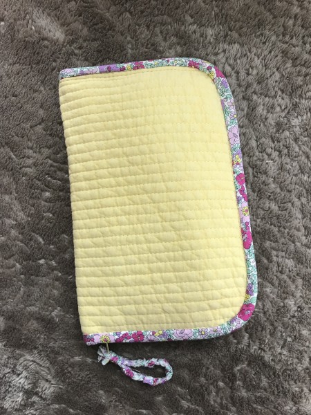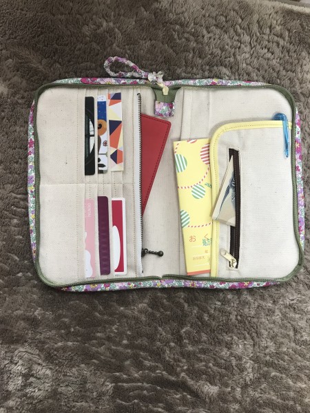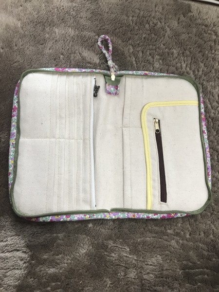 | ヌビ生地のポケットいっぱいファスナーポーチ。リバティー柄のパイピングでかわいく仕上げました。 ポケットも自分の好きな高さにしたり、ファスナーポケットを増やしたり、本を参考にアレンジを加えてみました。 周りのファスナーの取り付けが難しく何度かやり直しながらやっと完成。スッキリ整理できそうです。 |