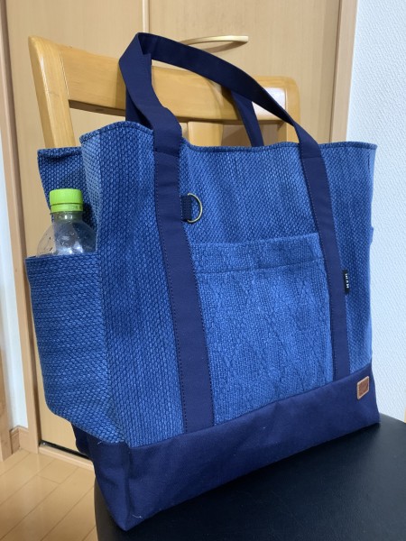 | 帆布✖️剣道の道着 ふたつの素材を使って同時に2つのトートバッグを作成しました。 帆布は濃紺とくすみブルーを使用。 表に3個のポケット、裏にファスナー付きのポケットをつけました。 クリーム色の裏地の内ポケットには剣道にゆかりのあるトンボ柄を忍ばせました。 |
