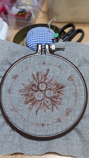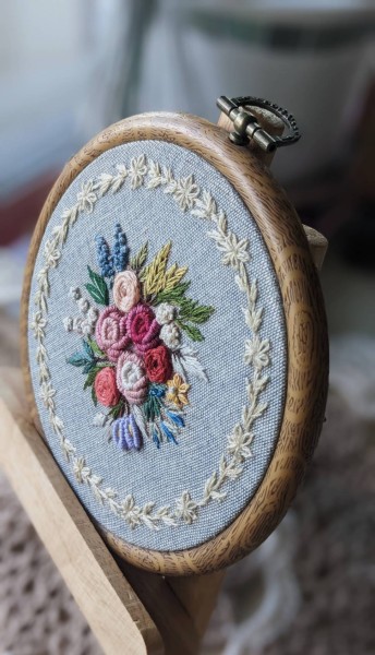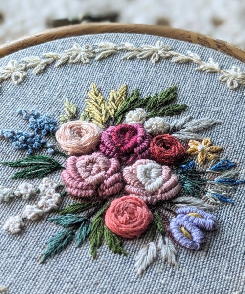 白い花の装飾ラインの輪の中に、優しい色味のブーケを刺繍しました。