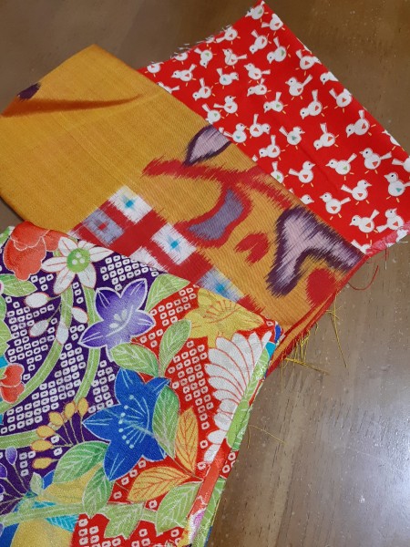 集めていた古裂を使ってコースターを作りました。後は黒の木綿布です。ボロ隠しに刺繍糸でフリンジをつけました。