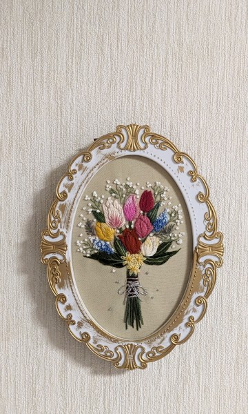 色も形も多種多様で多彩なので、最初は難しかったのですが、作っていくうちに自分なりに好みのチューリップと刺し方が決まっていく感じです。