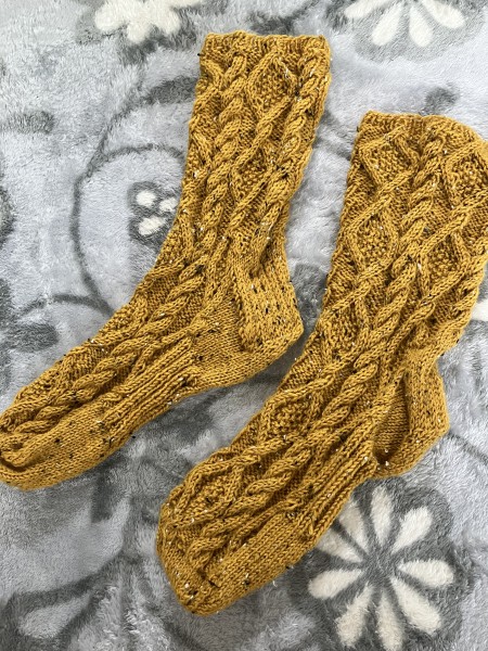 ツイードのソックヤーンを手に入れたので、アラン模様のソックスだ!とひらめいて編み始めました