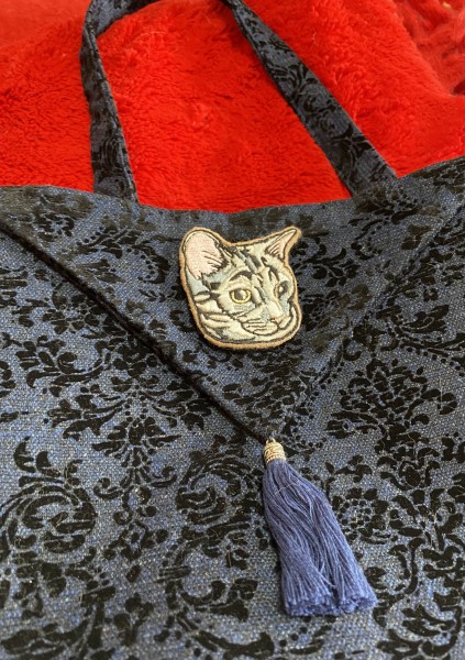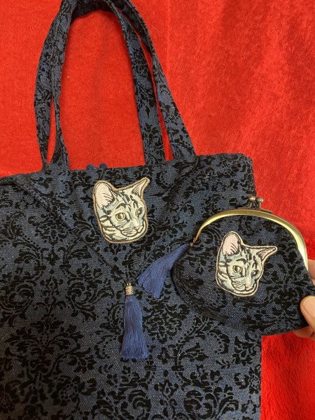 画像をいただいた猫さんを刺繍にし、トートバックとがま口に仕上げてみました。同じ色のフリンジをつけて品よく。