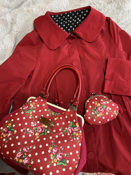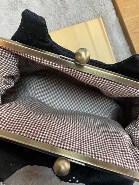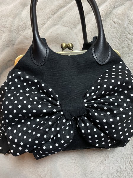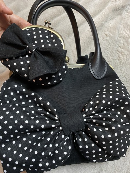 黒ドットのがま口バックです。お揃いでがま口も作りました。春コートが赤と黒ドットのリバーシブルなので、黒ドットの時用に作りました。