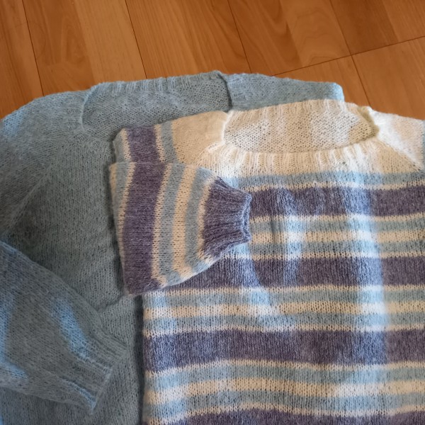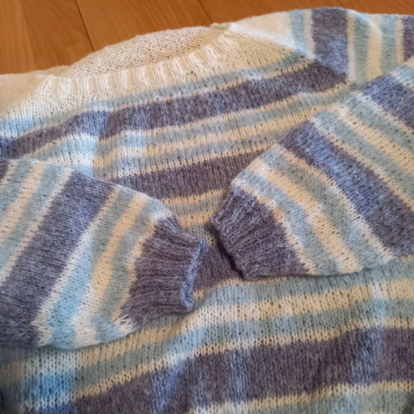 もう少し細いストライプで編んでいたのですが、糸を変えるときにうまくいかないのと、柄がちょっと違うな…と思って、この変則的なストライプに変えました。あと少し…ってところで白が足りなくなったので、ゴム編みをあきらめてネイビーに変えました。まぁ、白だと袖丈が短かったので、ネイビーにして良かったかな…。白いほうをほどいて、編み直して完成です。