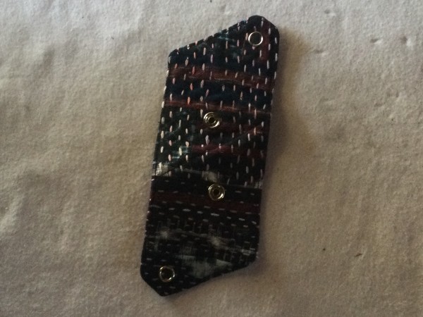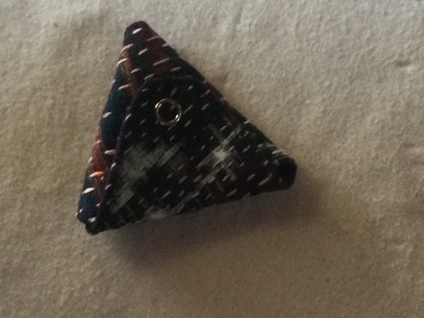 絣地に刺し子をして三角コインケースに仕上げる