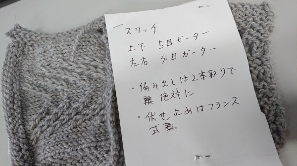 2023/4/7模様編みは理解、マスターしました。スワッチの作り方もついでに理解、①上下左右にガーター編みを入れる②後からも入れられるけど段から目を取ると場合によってはゆがむので計画的にはじめから入れる。また、スワッチや試し編みなど途中経過の扱いとして③失敗しても解かずに問題点を記入したメモをつけるなどの整理方法も思いつきました。ホチキスで止めると編み地を傷つけずにしっかりメモを残せました。(手書き文字がお見苦しくてすみません)