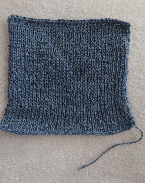 使用糸(ハマナカフラックス)のゲージ取りを開始しました。輪で編み始めるため後から長さ調節が出来ず、この作業は重要です。フラックスは綿+麻線維が混紡されたさらりとした風合いの細糸でハリがあります。伸縮性ないため編みにくくゆるみ勝ち、目が安定せず慣れるのに時間がかかりました。標準のゲージに寄せるには