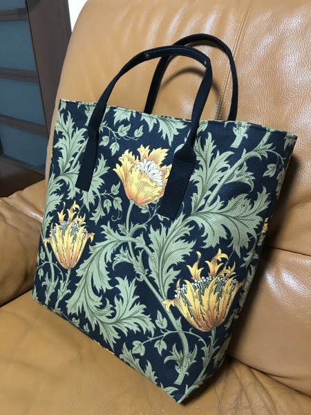 ウィリアムモーリスのお気に入りの生地でトートバッグを作成。高級感のある雰囲気を目指しました。大きめで買い物してもたくさん入るからエコバッグ要らず。