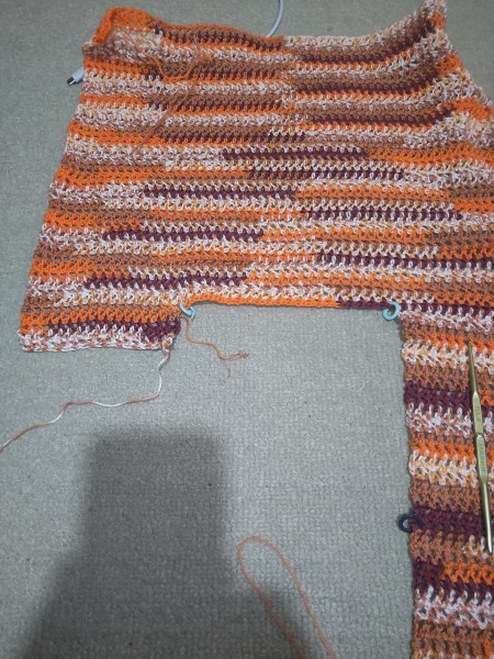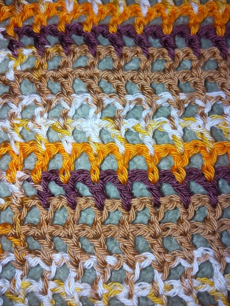 伸びにくい編み地で、なるべく軽く仕上げたいので長編みで方眼にしております。