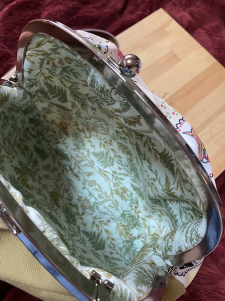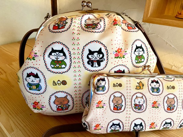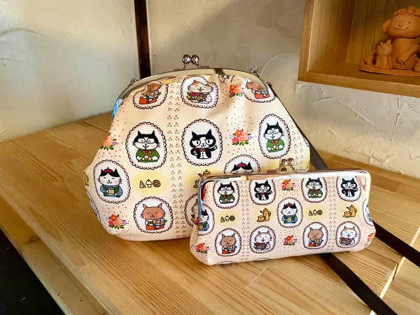 オリジナルの布第二弾を使ってふっくら大きながま口ショルダーバックを作りました。ペットボトルも長財布も楽々入ります。布は撥水加工されたものなので、汚れに強く埃もよせつけません。