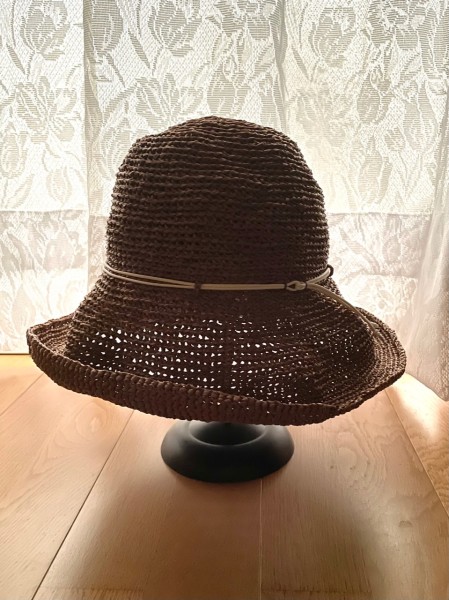 ちょっと自分の頭が大きいのとゆったりめにかぶりたかったのでレシピより少し大きめに編みました。日除けに良さげ。たたんでカバンに入れられます。