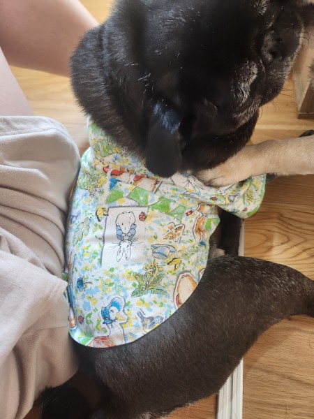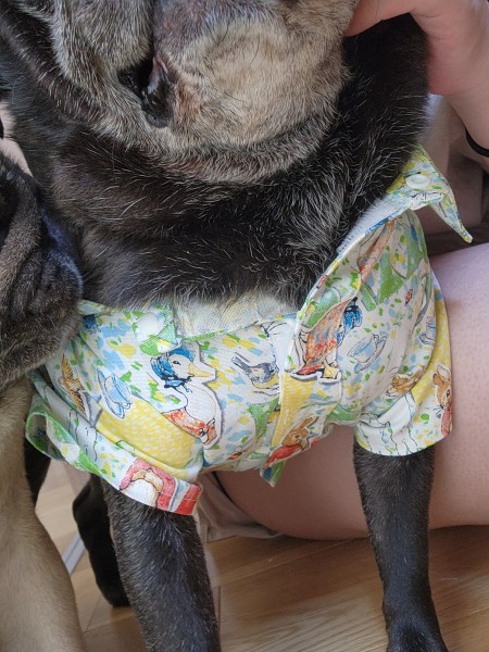 | 生地が賑やか LLだと大きかったのでLサイズにて作成。 タンクトップしか作ったことなかったのでパーツの多さ、縫い方の複雑さ、型紙の取りにくさ、など四苦八苦した。 型紙取るのに4時間 縫い代つけたり裁断したり接着芯つけたりに3時間 縫い始めて多分8時間。 達成感と疲労感でいっぱいの中いざ着せてみるとサイズが小さかった… 白犬は全く止めれない 黒犬は上の面ファスナーとスナップボタンが止めれないものの辛うじて下のファスナーは止めれた。 XLの型紙を取ったらまた作ってみよう。 |