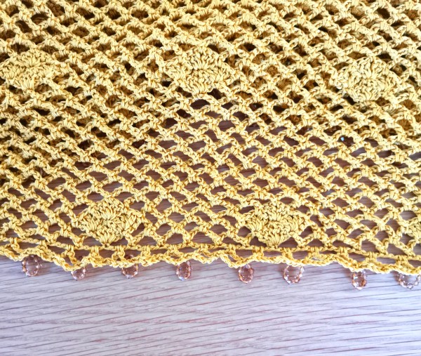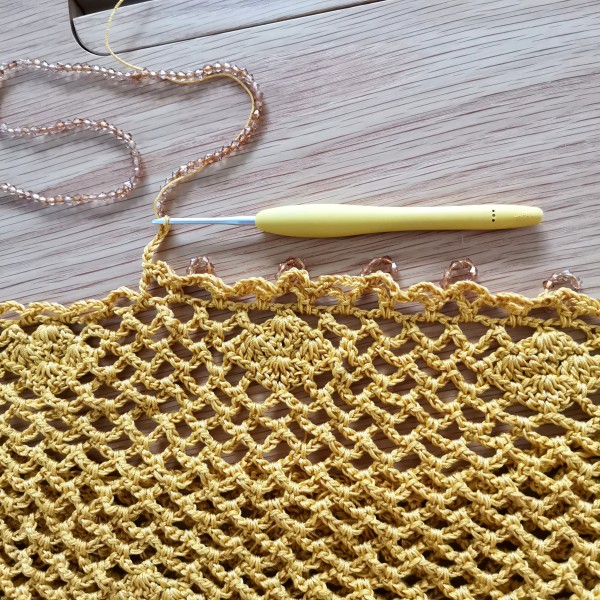 | 涼しく着用できるサマーベストをネット編みと松編み模様で編みました。 編み物教室の講師のお仕事の際に着用するため、裾にはソロバンビーズを編みつけてお洒落な感じに仕上げました。 |