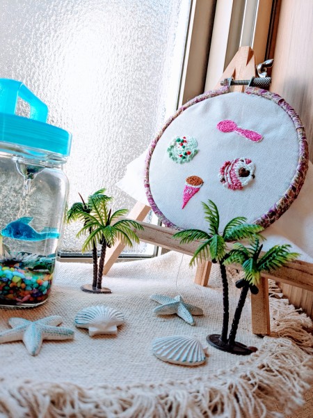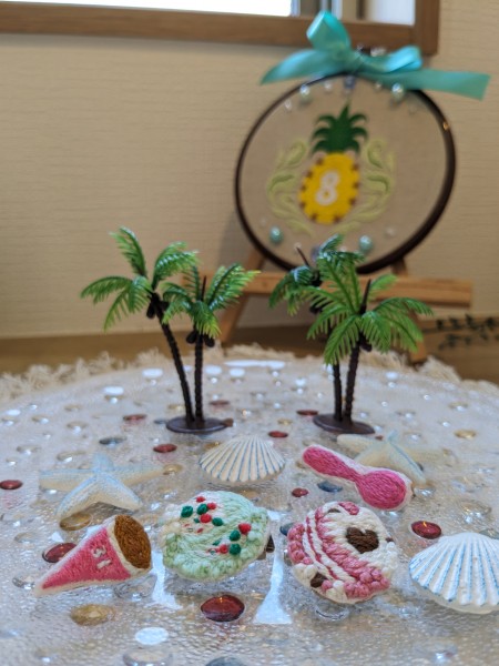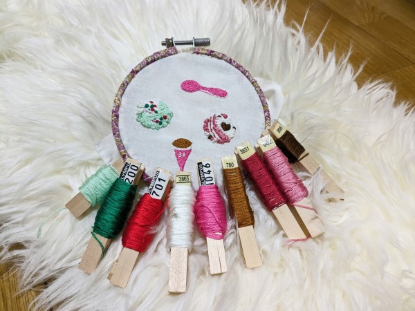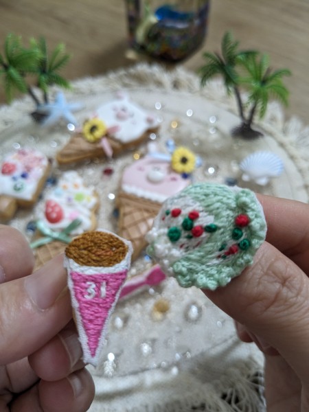 | サーティワンアイスクリームの ポッピングシャワーと、ラブポーションサーティワンの刺繍をしました。 小さなブローチに。 YouTubeの動画でサーティワン刺繍のやり方を上げていた方がいたので、完全なる真似っ子です。 アイスは直径2センチくらいなので、コーンとスプーンはブローチピンが付けにくかったです |
