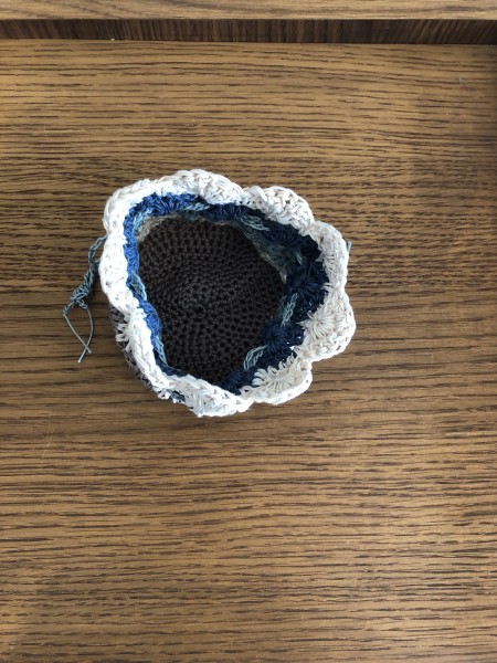 レース糸2本取りで編んだハーレクインステッチにミニ巾着。