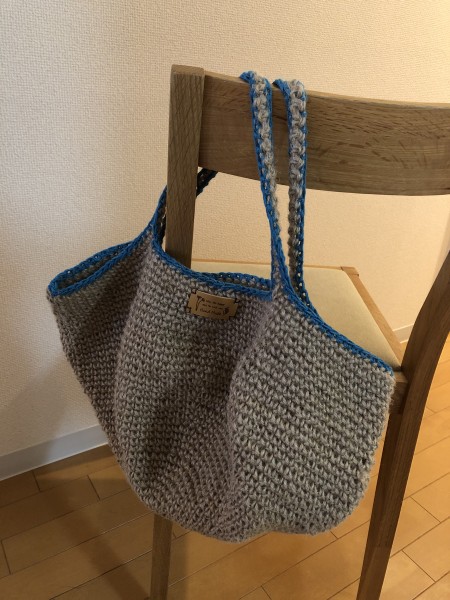 コクヨの麻紐を使い、円底のコロンとした形の肩掛けマルシェバッグ。仕上げにタグを付けてみました。容量はかなり大きめです。