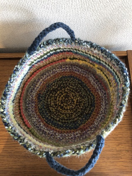 冬糸の余り毛糸を大量消費でカラフルなバスケットをメリヤス細編みで編みました。色々収納できそうです。