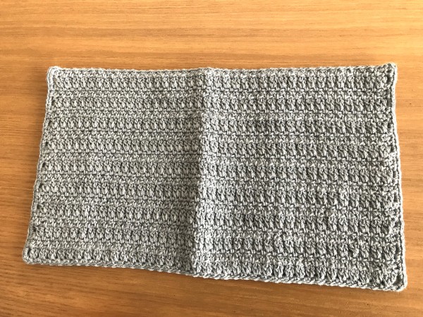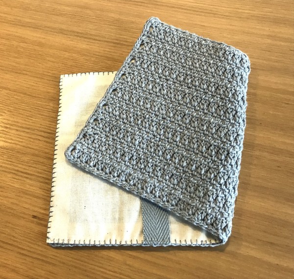 文庫本用のブックカバーです。外側はかぎ針編みの編地、グレー一色で地味ですが、V字編みや細編みを組み合わせた地模様です。