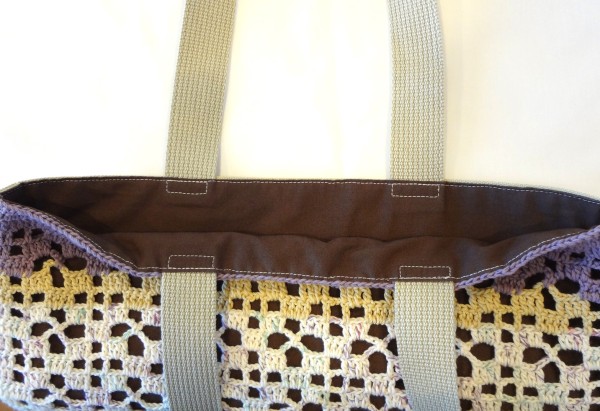 内側は綿布、外側前面にかぎ針編みの編地をつけました。後面は帆布、持ち手は幅3㎝のかばんテープです。