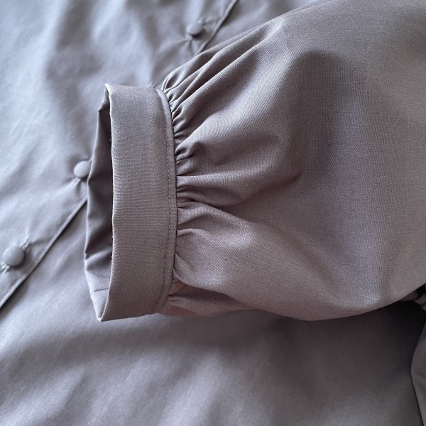 | 『シンプルで着やすいまいにち服』から、五分パフスリーブのフレアブラウスを縫いました。 チョコレート色の綿ポリ生地で、ややハリがあります。 ギャザーがきれいに出て、パフスリーブの形もきれい! ただちょっと縫い縮みしやすかったかも。。 後ろボタンは迷いましたが、共布でくるみボタンを作りました。 |